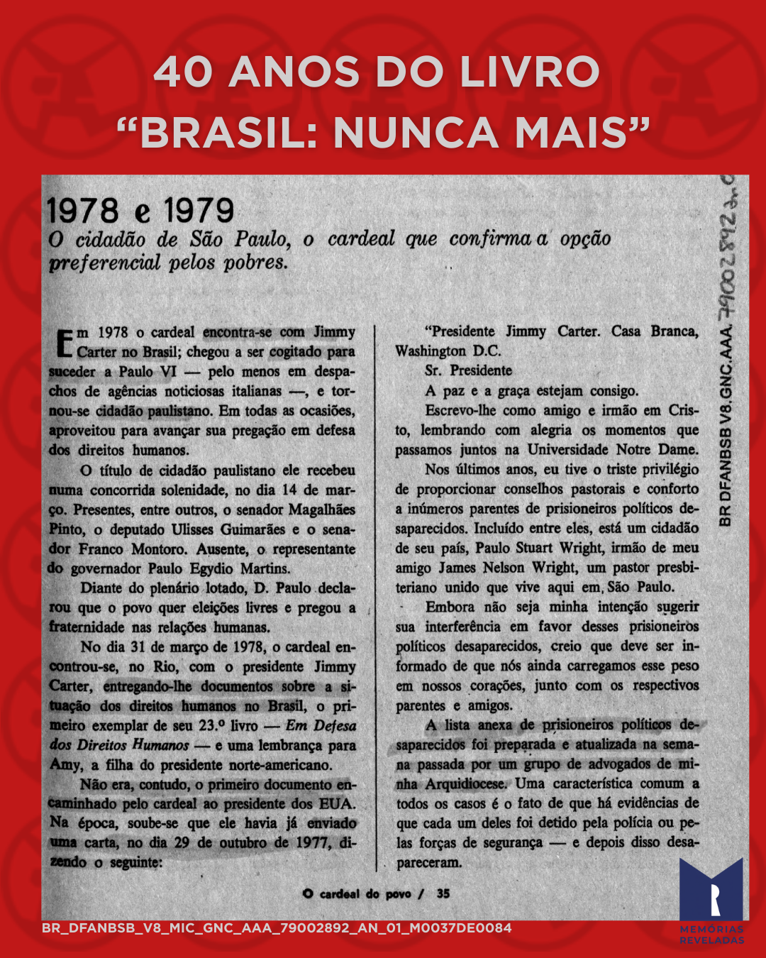 Não nos espanta que na documentação do Serviço Nacional de Informações conste uma série levantamentos e relatos da vigilância sobre as atividades destes religiosos. Influentes e ativos na defesa dos Direitos Humanos, procuravam diversos caminhos que a ditadura considerava perigosos, como, por exemplo, denunciar torturas internacionalmente, como no caso das cartas escritas por D. Paulo ao presidente estadunidense, Jimmy Carter. Na carta, Arns entrega uma lista de cidadãos brasileiros desaparecidos, entre eles, o irmão de Jaime Wright, Paulo Stuart Wright.