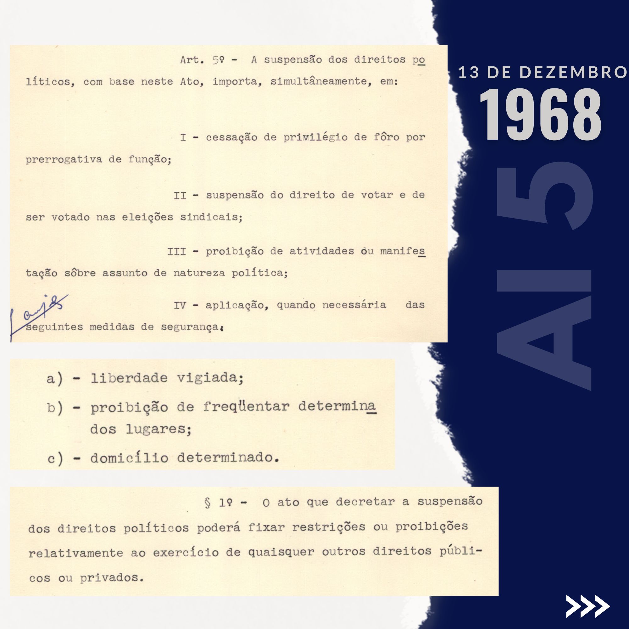 Em 13 de dezembro de 1968, o governo militar implementou o Ato Institucional no 5, um instrumento legal que retirou os direitos constitucionais que restavam depois do golpe de 1964, aprofundando a repressão no Brasil.