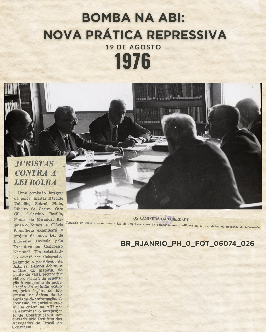 Em meados dos anos 70, os membros da ABI passaram a ser mais coesos na resistência à ditadura. Em 75, o presidente Elmano Cruz pronunciou-se contrariamente às violações de direitos humanos e o seu sucessor, Prudente de Morais Neto (1975-1977), condenou publicamente o assassinato do jornalista Herzog no DOI-CODI/SP. Em meio à crise do sistema repressivo e à abertura política de Geisel e Golbery, o posicionamento crítico da ABI a tornou alvo de setores extremistas pró-ditadura. Foi então que, em 19/08/76, a sua sede, no Rio de Janeiro, sofreu um atentado à bomba. Sem feridos, destruiu por completo seu 7º andar, onde funcionavam o Conselho e a Presidência. Horas mais tarde, outro explosivo foi encontrado nos arredores, na OAB, sendo desativado a tempo.