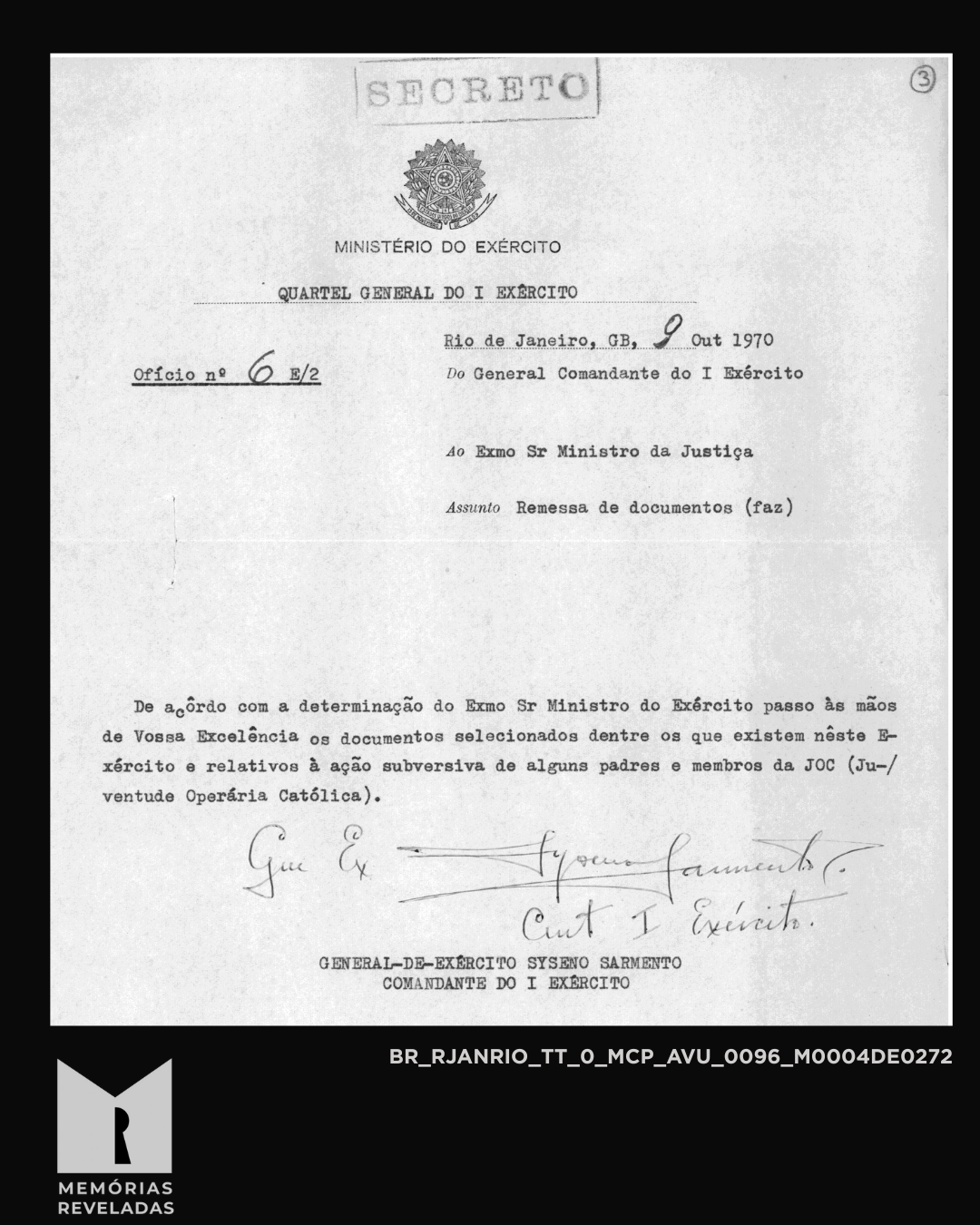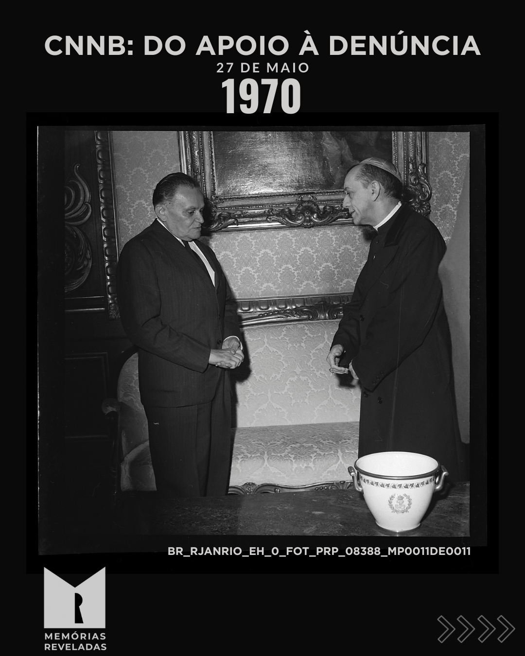 Em Brasília, no dia 27 de maio de 1970, a Conferência Nacional dos Bispos do Brasil (CNBB) encerrou a sua 11ª Assembleia Geral, na qual a Igreja Católica tomou posição contra o autoritarismo do Estado brasileiro e divulgou um documento denunciando os abusos da ditadura militar sobre os direitos humanos e sociais. Em contraste ao posicionamento de apoio firmado pela cúpula católica ao general Castello Branco, por ocasião do Golpe de 1964, a hierarquia religiosa foi gradativamente posicionando-se contra às violações aos direitos humanos e sociais cometidas pela ditadura brasileira – como podemos observar nos dois primeiros documentos em destaque.