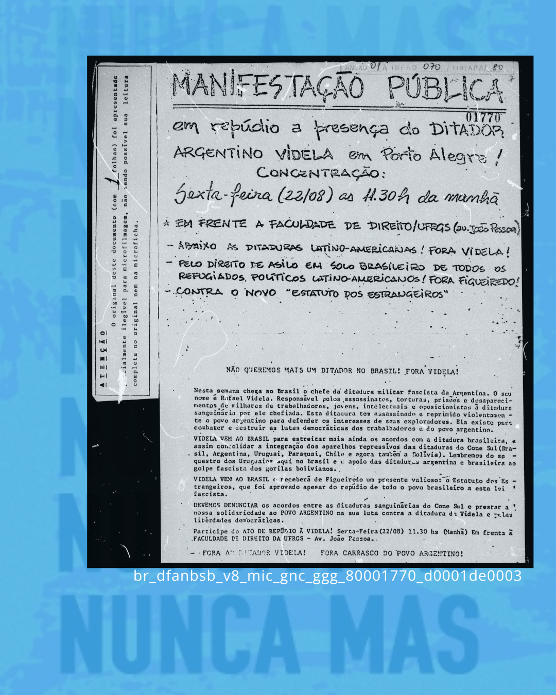 Um deles foi o general Jorge Rafael Videla, condenado à prisão perpétua em 2010. Sua visita ao Brasil em 1980, no contexto de cooperação entre as forças armadas no poder no Cone Sul, motivou protestos contra a ditadura brasileira e denúncias de acordos entre Videla e Figueiredo, como se vê no documento produzido pelo Serviço Nacional de Informações, parte do Fundo SNI (V8), do acervo do Arquivo Nacional.