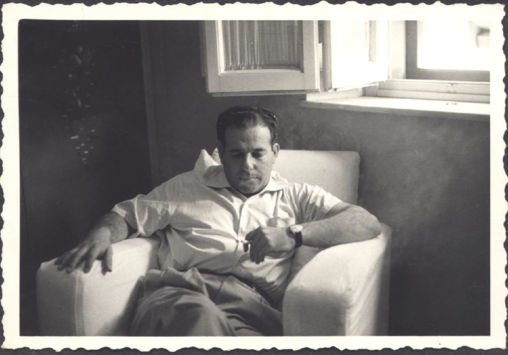 Fotografia de João Belchior Marques Goulart, presidente da República, sentado em uma poltrona, embaixo de uma janela, durante seu exílio no Uruguai