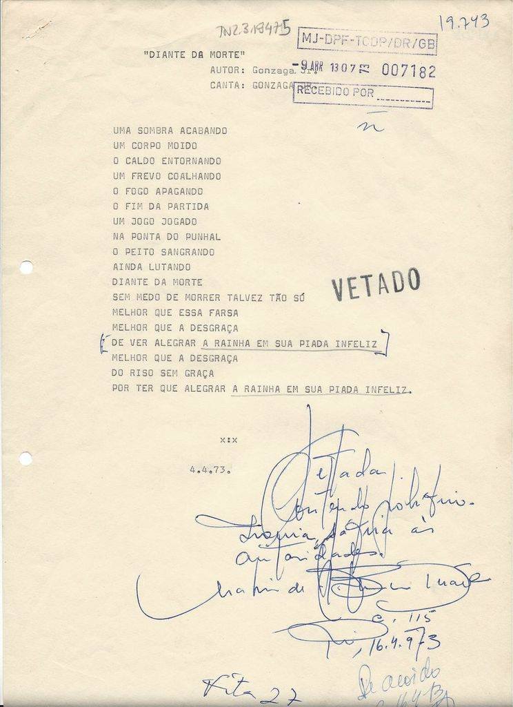 Letra da canção "Diante da Morte", de Gonzaguinha, censurada em abril de 1973 por ter "conteúdo político", "ironia" e "sátira às autoridades"