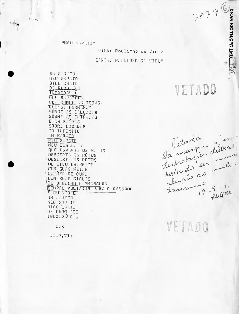 Letra da Canção "Meu sapato", de Paulinho da Viola, censurada em setembro de 1971