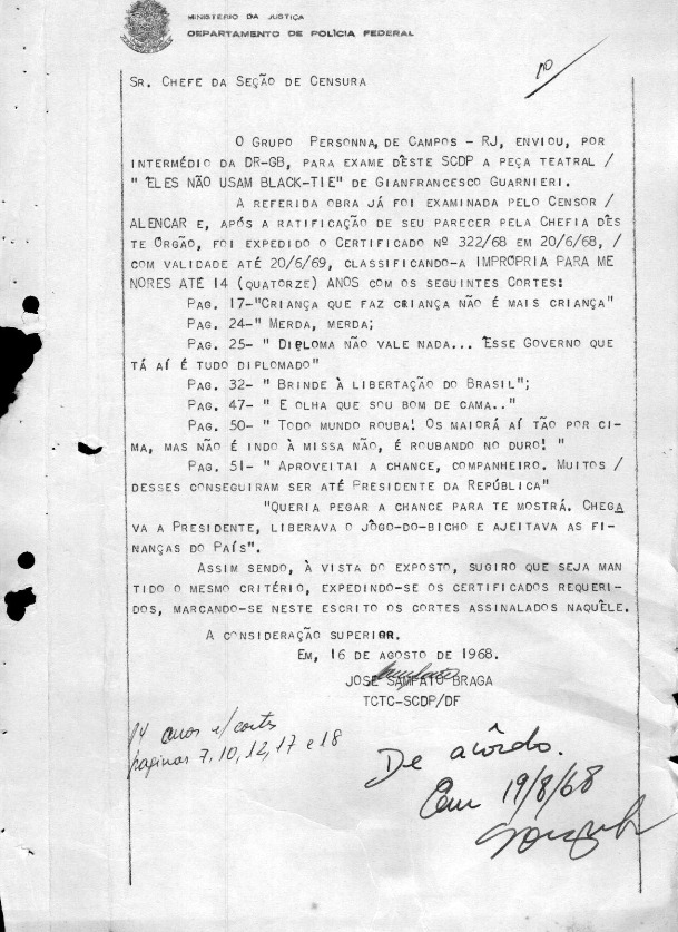 Parecer censório de agosto de 1968 exigindo vários cortes da peça “Eles não usam Black-tie”, de Gianfrancesco Guarnieri