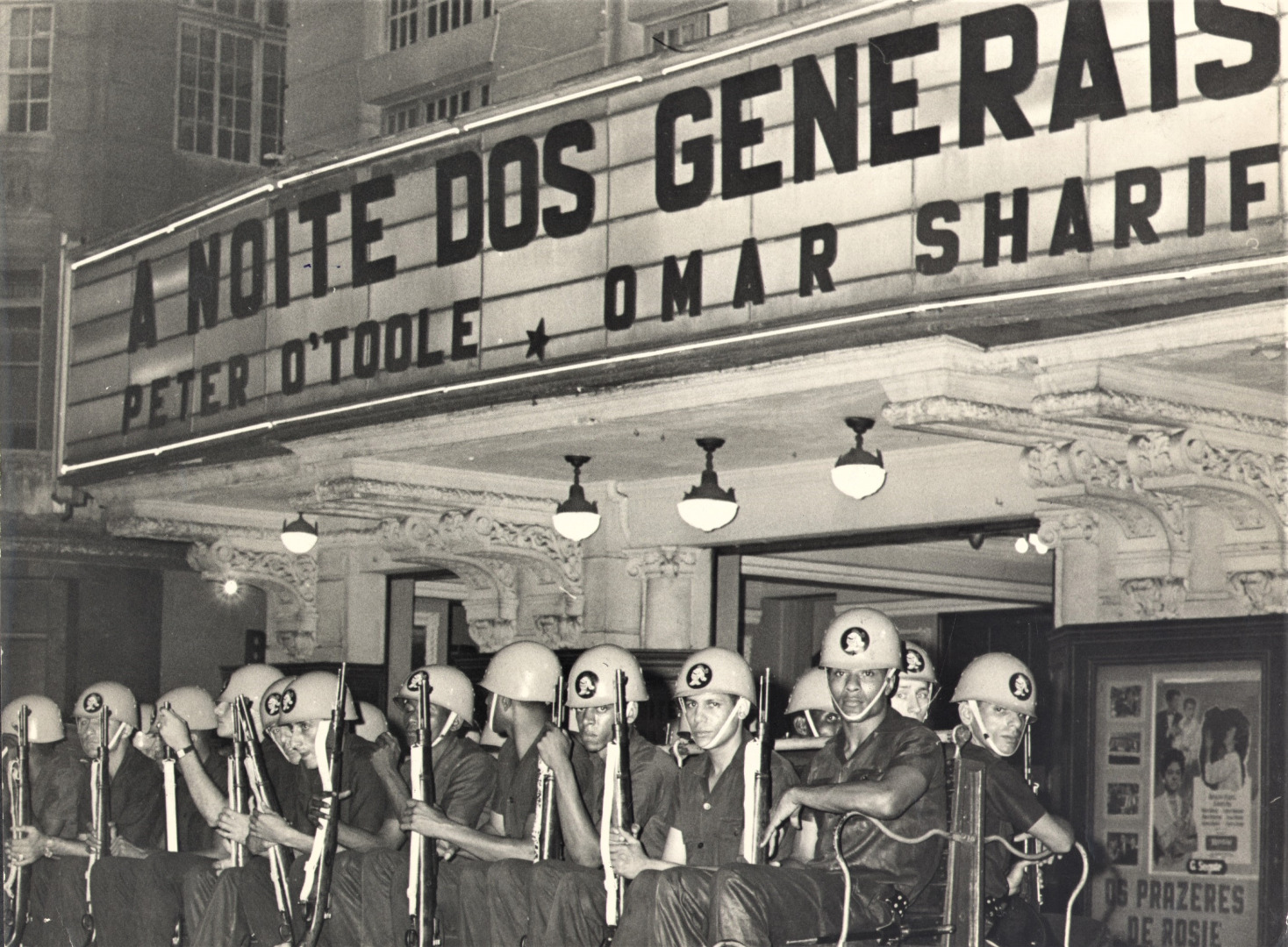 Durante a cobertura de grandes manifestações populares contra a ditadura, o jornal aproveitou para criticar o regime enquadrando agentes da repressão sobre um pano de fundo com letreiros de cinema.