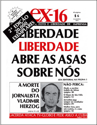 Produzido entre 1973 e 1975, com periodicidade mensal, o jornal EX- foi um dos expoentes da chamada mídia alternativa durante a ditadura militar, reconhecido por suas reportagens aprofundadas, textos ácidos e imagens provocativas. Seus vinte números, que incluem edições especiais foram reunidas pela Imprensa Oficial e Instituto Vladimir Herzog em versão fac-símilar impressa e estão disponíveis para consulta nos links abaixo.