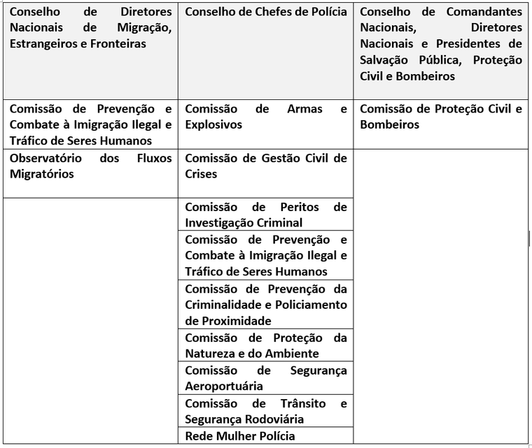 Os Conselhos de Chefes de Polícia; de Diretores Nacionais de Migração e Fronteiras e de Comandantes Nacionais, Diretores Nacionais, Presidentes de Salvação Pública/Proteção Civil/Bombeiros são Estruturas de Apoio da Ministerial do Interior e Administração Interna da CPLP.