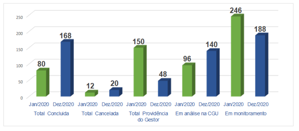 Ressalta-se que as recomendações em monitoramento, que no início do ano eram de 246 recomendações, diminuíram para 188 no final do exercício 2020, portanto, houve uma redução de 58 recomendações nesta situação, o que irá possibilitar uma melhor gestão para o exercício de 2021.
