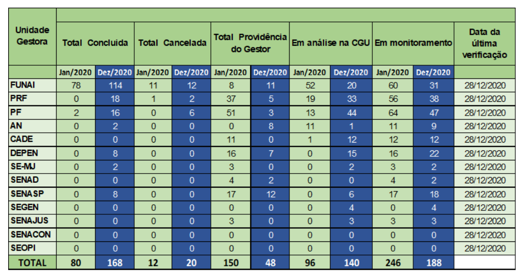 Destaca-se também que houve uma diminuição de 102 recomendações com providências a cargo do Gestor (Unidades do MJSP), saindo de um total de 150 no início do ano (Jan/2020) para 48 no final do ano (Dez/2020).