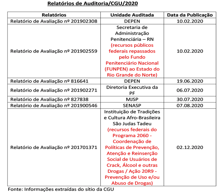 A seguir, apresento a planilha contendo a relação das Auditorias da CGU, publicadas em 2020, bem como informo que os respectivos relatórios encontram-se disponíveis na parte superior desse informativo: