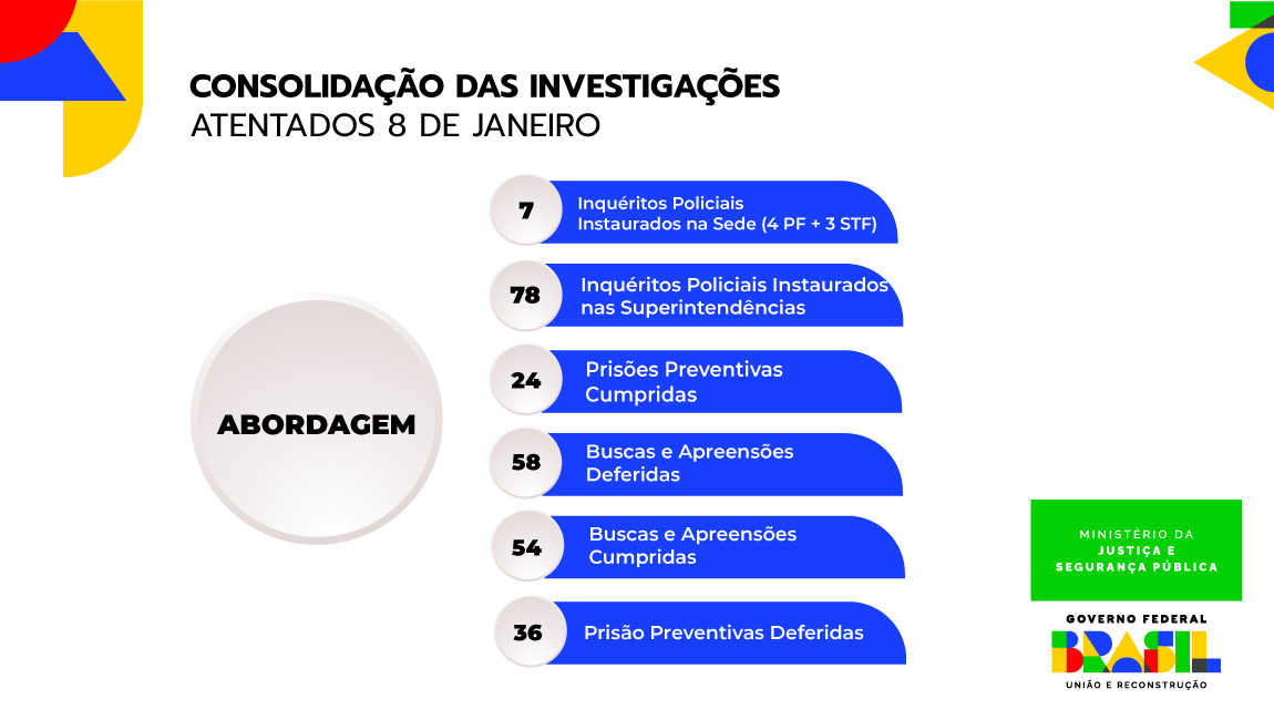 Os desdobramentos dos atos antidemocráticos do dia 8 de janeiro também foram abordados na ocasião. Até o momento, 24 prisões foram cumpridas e há mandado para outras 12. Quanto às diligências, estão abertos 85 inquéritos - 7 no Distrito Federal e 78 nos demais estados. O número de buscas e apreensões chega a 54.