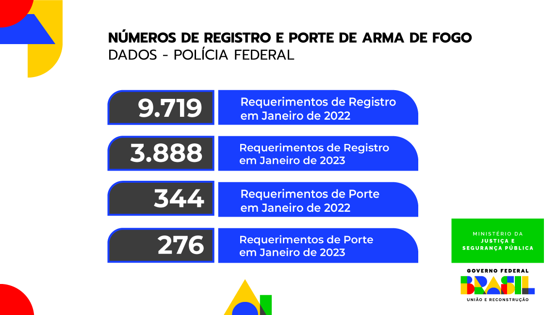 Já o número de requerimentos de registro e porte de arma de fogo diminuiu em quase seis mil, em comparação com janeiro de 2022. “O decreto, além de estar compatível com a Constituição e com a lei, está produzindo efeitos positivos, no sentido de haver o que nós buscamos, um controle responsável quanto a armas de fogo no Brasil”, afirmou o ministro.