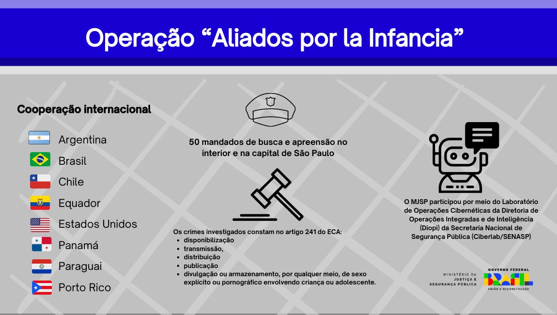 A Operação “Aliados por la Infancia” faz parte de uma mobilização internacional para combater crimes de abuso e exploração sexual de crianças e adolescentes na internet, integrada por meio de trabalho em conjunto conduzido por autoridades da Embaixada dos Estados Unidos na Argentina, U.S. Department of Homeland Security Investigations dos Estados Unidos e do Cuerpo de Investigaciones Judiciales do Ministério Público Fiscal da Cidade de Buenos Aires, com a participação do Brasil, através do Ciberlab e da Polícia Civil de São Paulo.