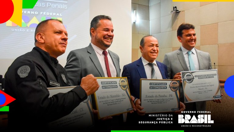 Brasília, 05/09/2023 - Com o intuito de incentivar a melhoria permanente do sistema prisional brasileiro, a Secretaria Nacional de Políticas Penais (Senappen), do Ministério da Justiça e Segurança Pública (MJSP), realizou, nesta terça-feira (5), a cerimônia de premiação das unidades prisionais modelo do país com a entrega do Selo de Gestão Qualitativa em Serviços Penais. O ato foi realizado na abertura da reunião conjunta do Conselho Nacional de Política Criminal e Penitenciária (CNPCP) e do Conselho Nacional dos Secretários de Estado da Justiça, Direitos Humanos e Administração Penitenciária (Consej).