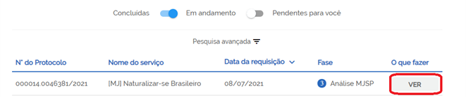 Nas fases em que o requerente não precisa praticar alguma ação, aparecerá a opção de VER conforme imagem abaixo, que permite visualizar apenas os dados preenchidos e a fase em que está a solicitação