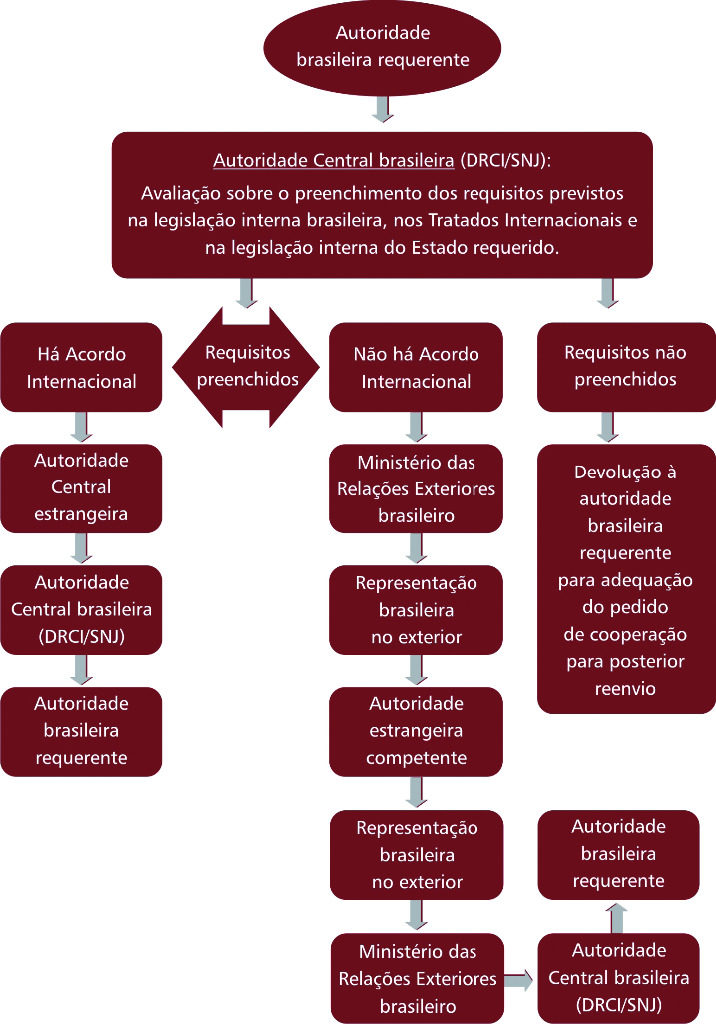 São consideradas partes legítimas, as autoridades brasileiras competentes pela investigação ou ação penal para a formulação de pedidos de cooperação jurídica internacional em matéria penal. Após a elaboração do pedido, este deverá ser encaminhado obrigatoriamente à Autoridade Central brasileira – Departamento de Recuperação de Ativos e Cooperação Jurídica Internacional - DRCI/Senajus/MJSP
