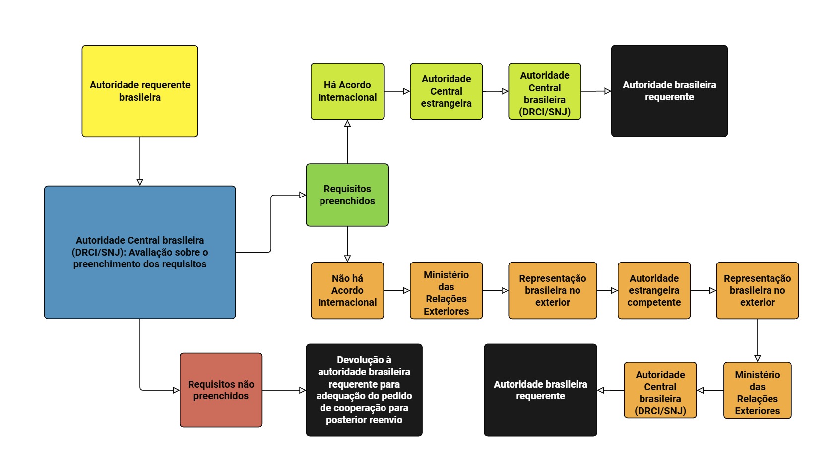 O DRCI/Senajus, como Autoridade Central do Brasil, conduzirá o fluxo dos pedidos internacionais realizando o juízo de admissibilidade administrativa e fará as adequações necessárias para garantir que o pedido atenda aos requisitos legais e tramite de forma célere e eficiente. Em seguida, encaminhará o pedido à Autoridade Central do país estrangeiro correspondente, buscando otimizar a celeridade e a efetividade da cooperação internacional.