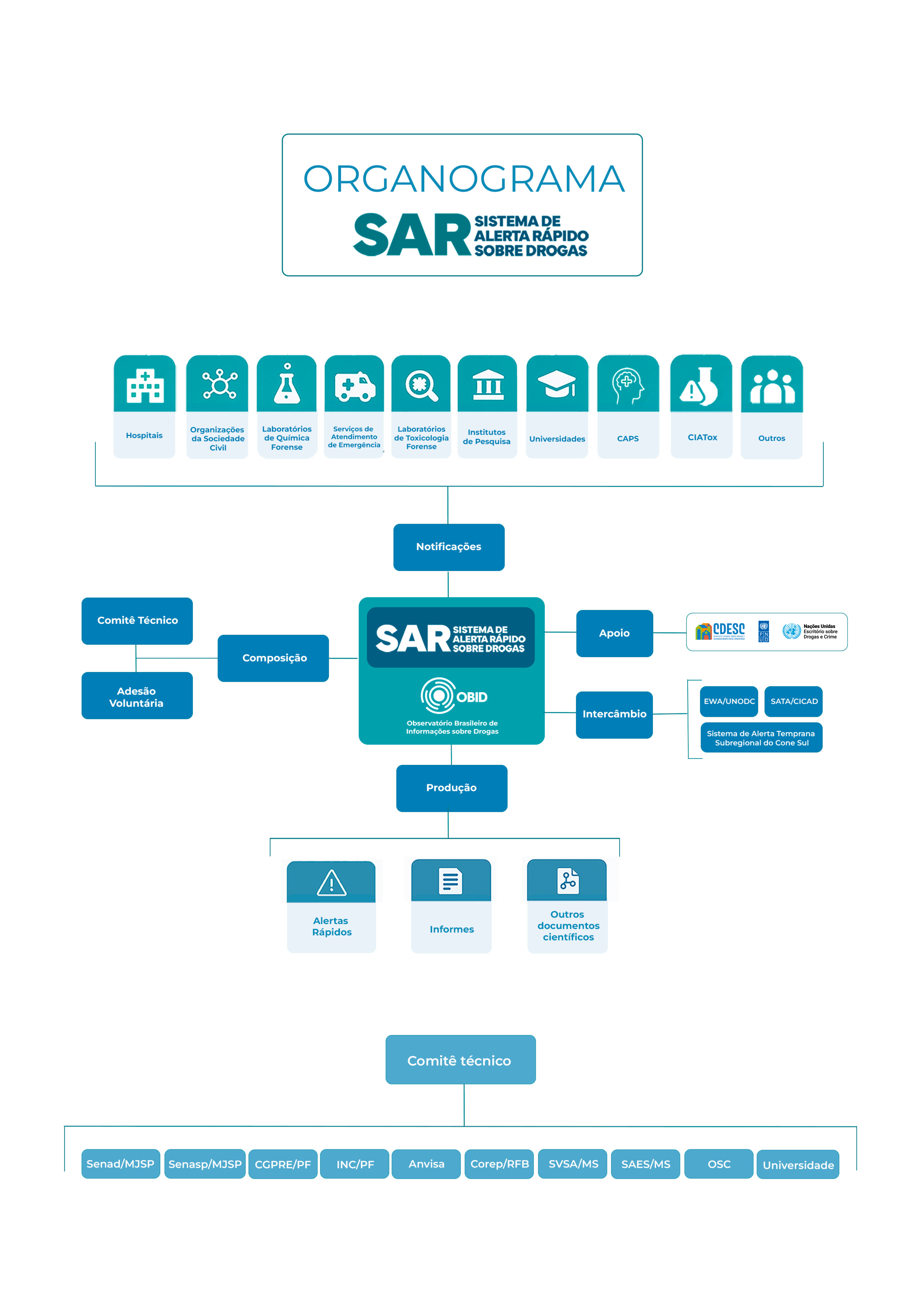 O Sistema de Alerta Rápido sobre drogas do Brasil (SAR) é um subsistema do Sistema Nacional de Políticas sobre Drogas - Sisnad, gerenciado pela Secretaria da Nacional de Políticas sobre Drogas e Gestão de Ativos - Senad, vinculado ao Observatório Brasileiro de Informações sobre Drogas - Obid.