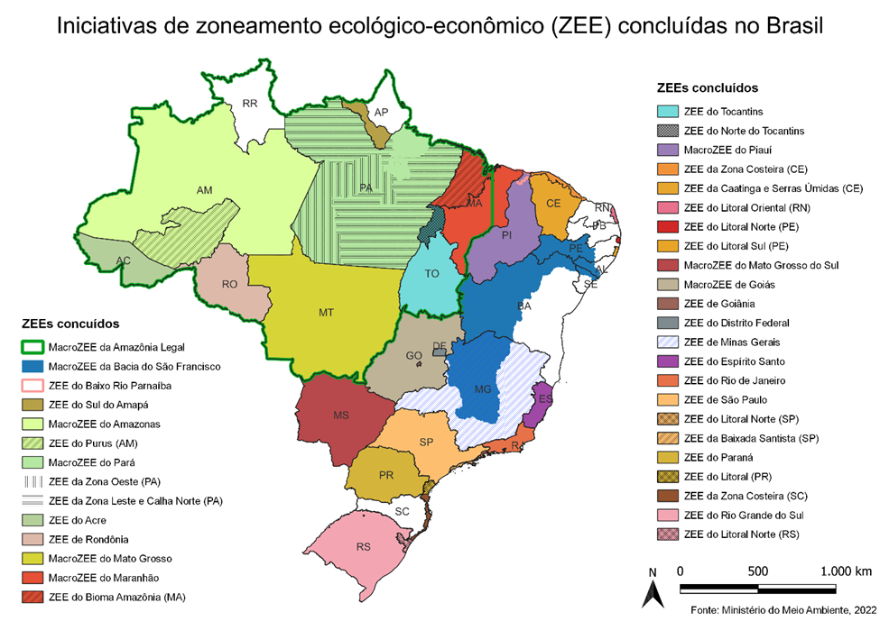 Como é possível observar no mapa a seguir, ainda há parte do território sem projetos de ZEE concluídos no Estado de Santa Catarina e em quatro Estados da Região Nordeste - Rio Grande do Norte, Paraíba, Pernambuco, Alagoas, Sergipe e Bahia. Os estados do Amapá e de Roraima, apesar de não terem concluído projetos estaduais, são contemplados pelo MacroZEE da Amazônia Legal.