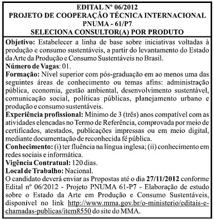 - Seleção para consultor do Projeto de Cooperação Técnica Produção e Consumo Sustentáveis. Confira o Termo de Referência nº 06/2012 e o Edital nº 06/2012