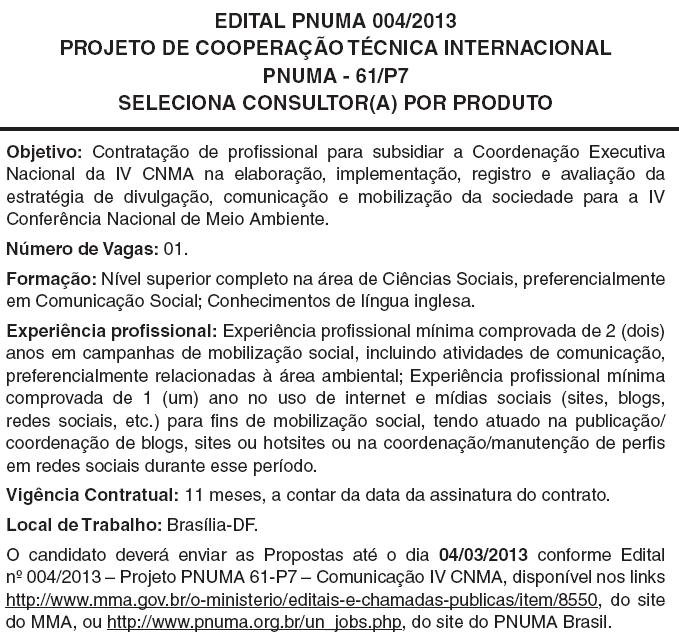 - Edital nº 004/2013 - Projeto PNUMA 61-P7 - Comunicação IV CNMA. Confira o Termo de Referência.