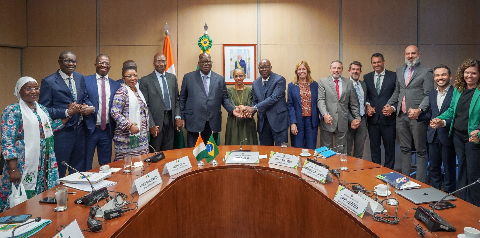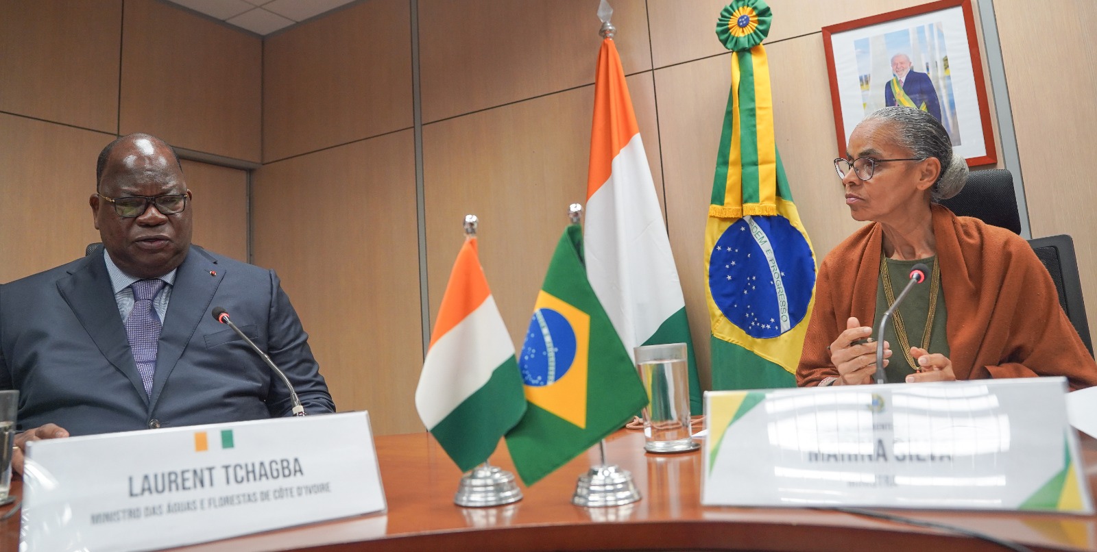 Ministros Marina Silva e Laurent Tchagba em reunião sobre cooperação climática e ambiental em Brasília (DF).