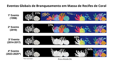 Gráfico mostrando a porcentagem da área de ocorrência de recifes de coral no mundo afetada nos quatro eventos globais de branqueamento em massa ocorridos. Fonte dos dados: NOAA. Elaboração: Carolina Chalegre, DOceano/MMA.
