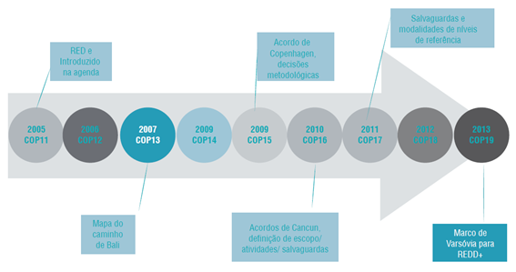 Figura - Histórico de evolução do tema REDD+ no âmbito da UNFCCC entre os anos de 2012 a 2013.