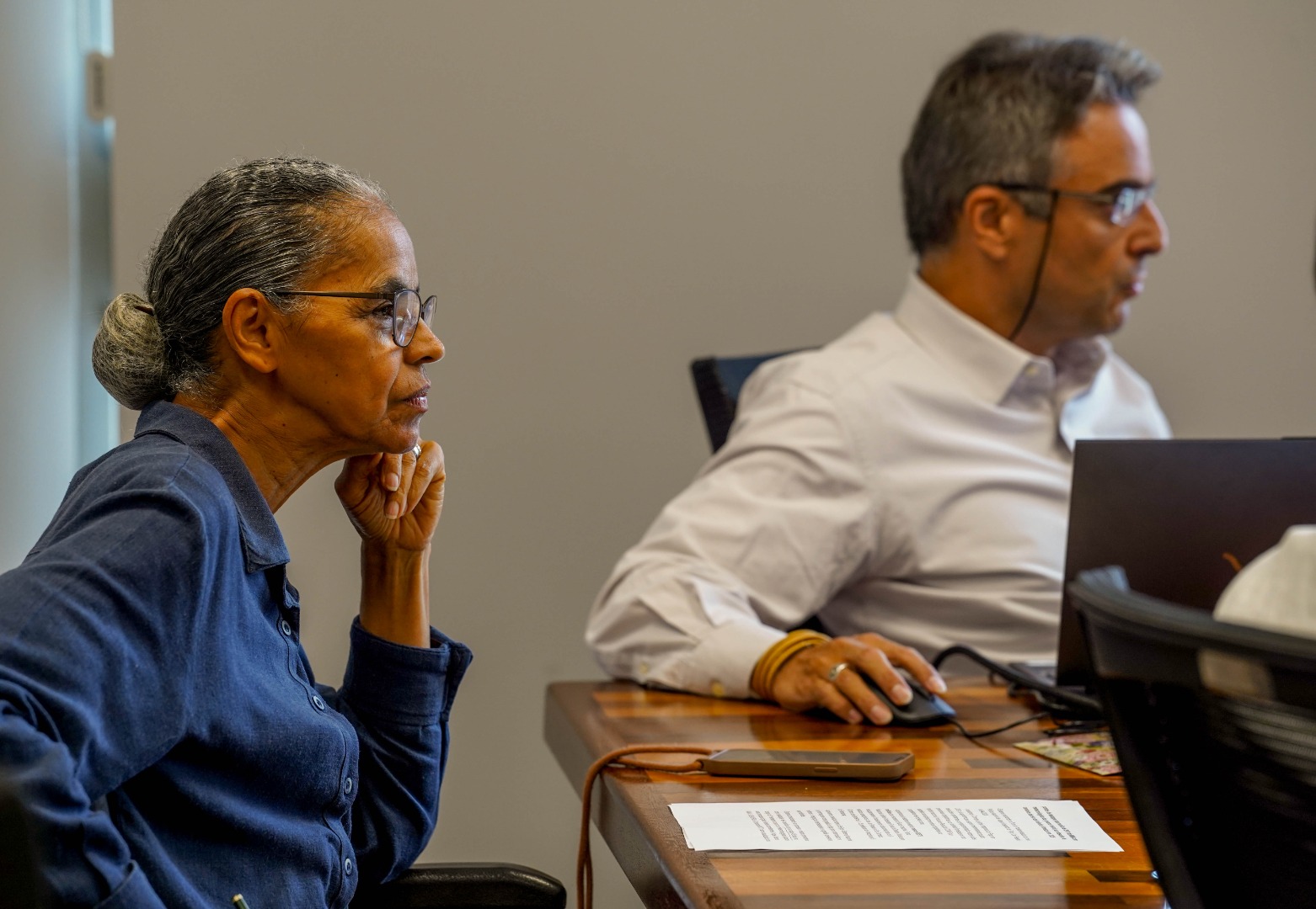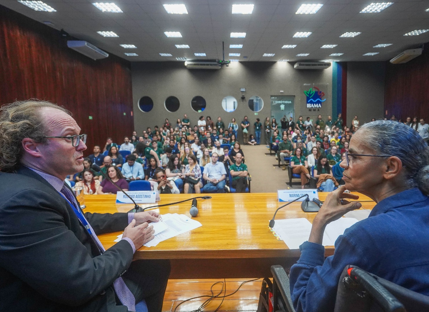 Presidente do Ibama, Rodrigo Agostinho, e a ministra Marina Silva durante evento de boas-vindas aos novos servidores.