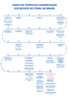 Linha do tempo com as principais ações e atos nacionais para a conservação dos recifes de coral. Elaboração: DOceano/MMA.