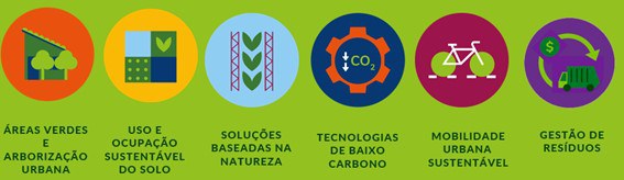 Envolve também algumas abordagens temáticas, que se integram e culminam em soluções socioambientais para uma série de problemas urbanos e impactos climáticos.