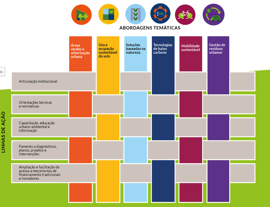 - desenvolver e fortalecer a capacidade institucional dos entes federativos, visando qualificar diagnósticos, planejamentos, governança, gestão e projetos, com foco em mitigação de emissões de gases de efeito estufa e adaptação à mudança do clima em áreas urbanas;