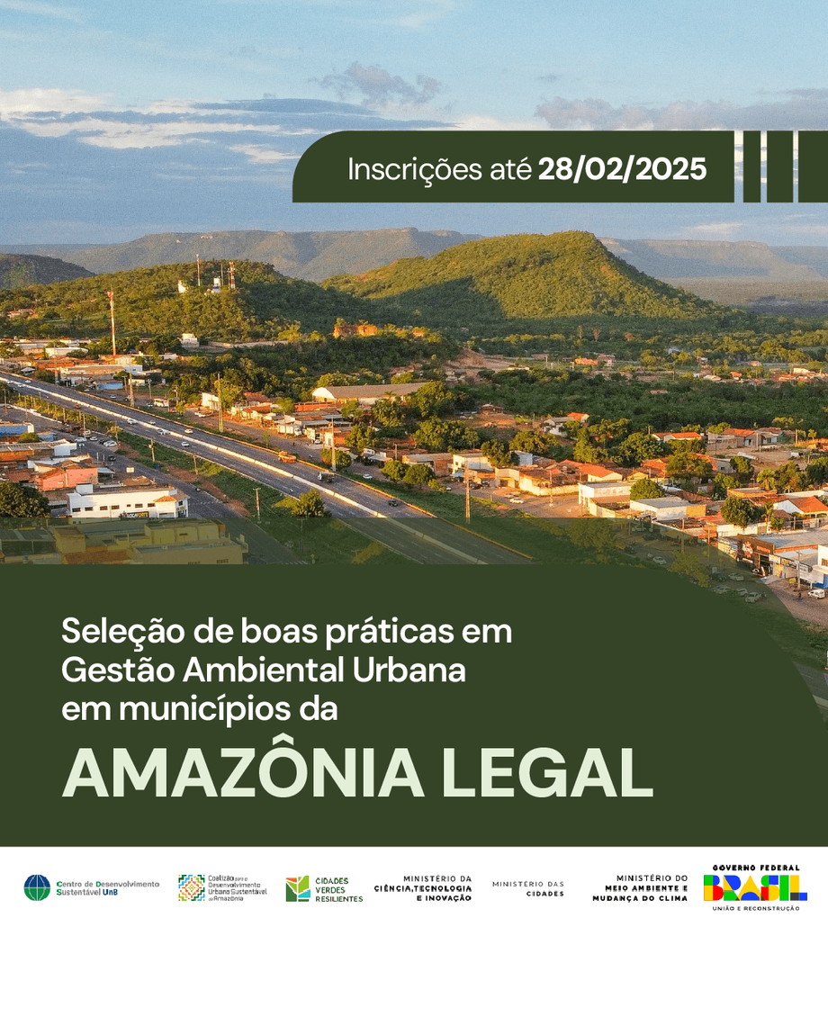 O Ministério do Meio Ambiente e Mudança do Clima (MMA), o Centro de Desenvolvimento Sustentável da Universidade de Brasília (CDS/UnB) e a Coalizão para o Desenvolvimento Urbano Sustentável da Amazônia (Coalizão DUSA) convidam as instituições e órgãos da administração municipal direta ou indireta e/ou a Câmara Municipal de municípios da Amazônia Legal a submeterem suas boas práticas em gestão ambiental urbana para a seleção do Guia de Boas Práticas em Gestão Ambiental Urbana na Amazônia Legal.