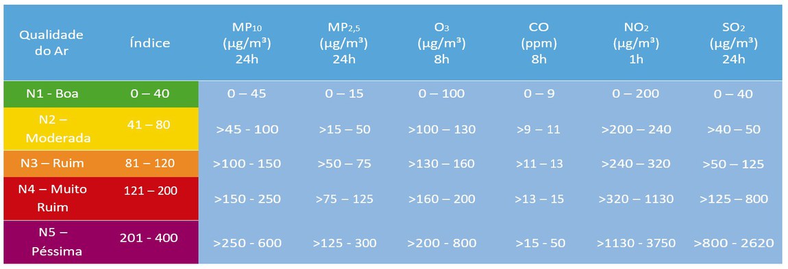 Os valores atualizados para o cálculo do IQAr estão apresentados no quadro abaixo.