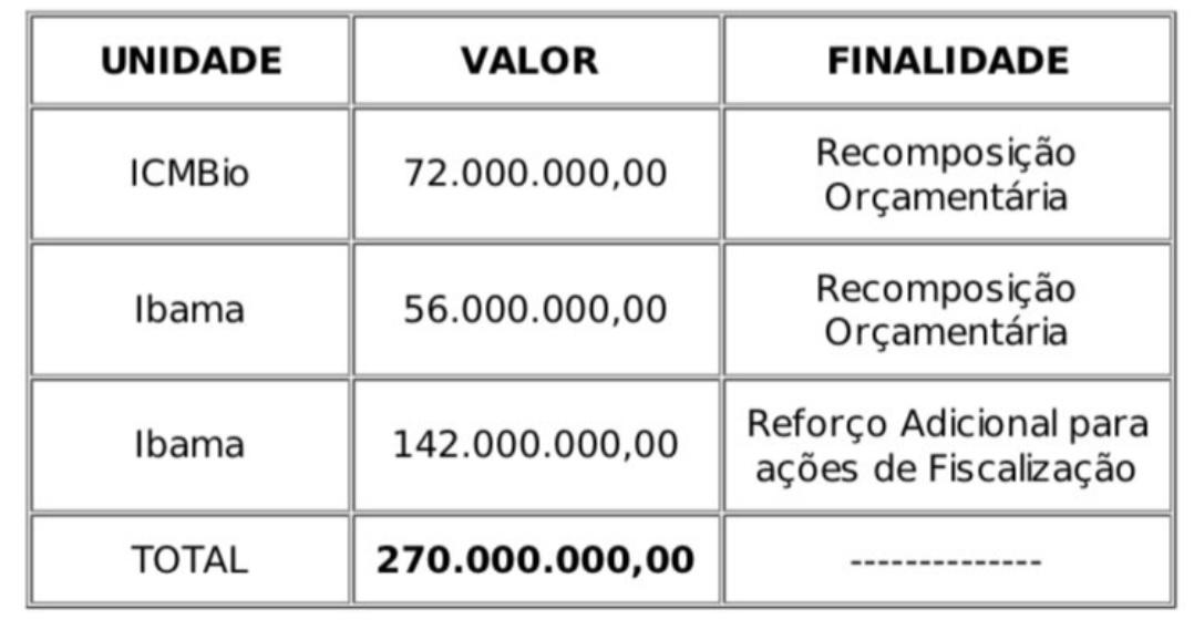 O Ministério do Meio Ambiente informa que já enviou ao Ministério da Economia pedido de recomposição orçamentária e duplicação de verbas, na ordem de R$ 270 milhões, para atividades de fiscalização, prevenção, além do combate ao desmatamento ilegal e de incêndios florestais. A verba também prevê ações de monitoramento ambiental.