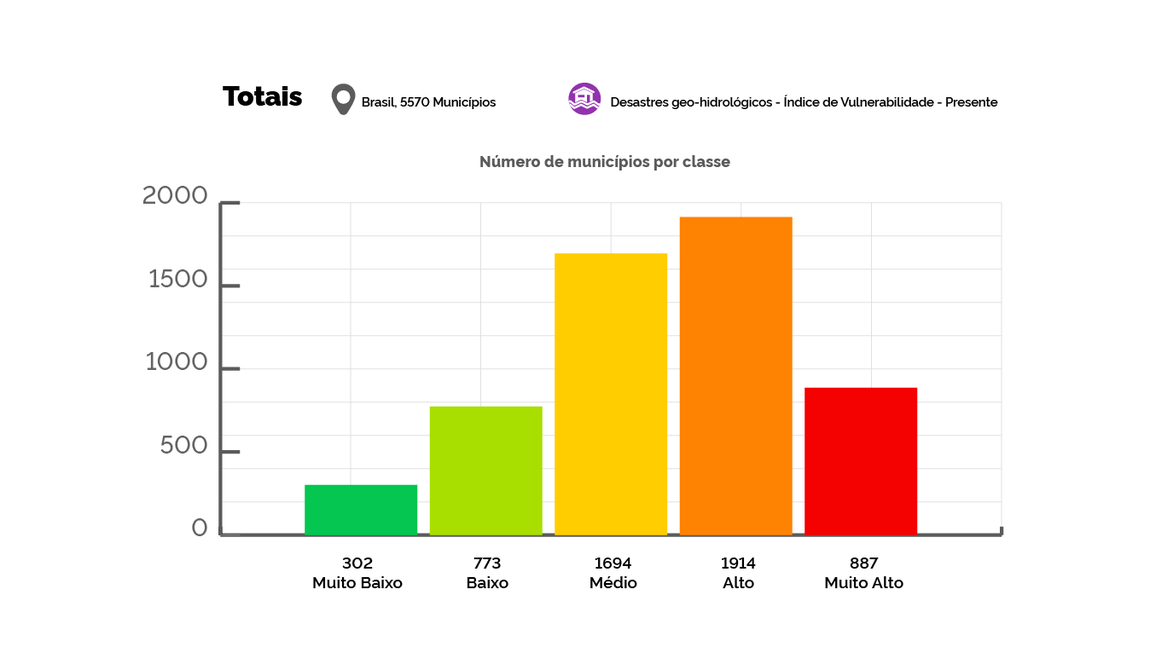 A adaptação às mudanças climáticas, que diz respeito a lidar com os seus impactos, com os quais já convivemos, envolverá o conjunto da população nos municípios, com menor ou maior risco. A Plataforma Adapta Brasil mostra que metade dos municípios brasileiros tem vulnerabilidade alta ou muito alta diante de desastres chamados geo-hidrológicos, como inundações, enxurradas e deslizamentos de terra. E quase um a cada quatro municípios tem vulnerabilidade alta ou muito alta a secas, como mostram os gráficos abaixo.