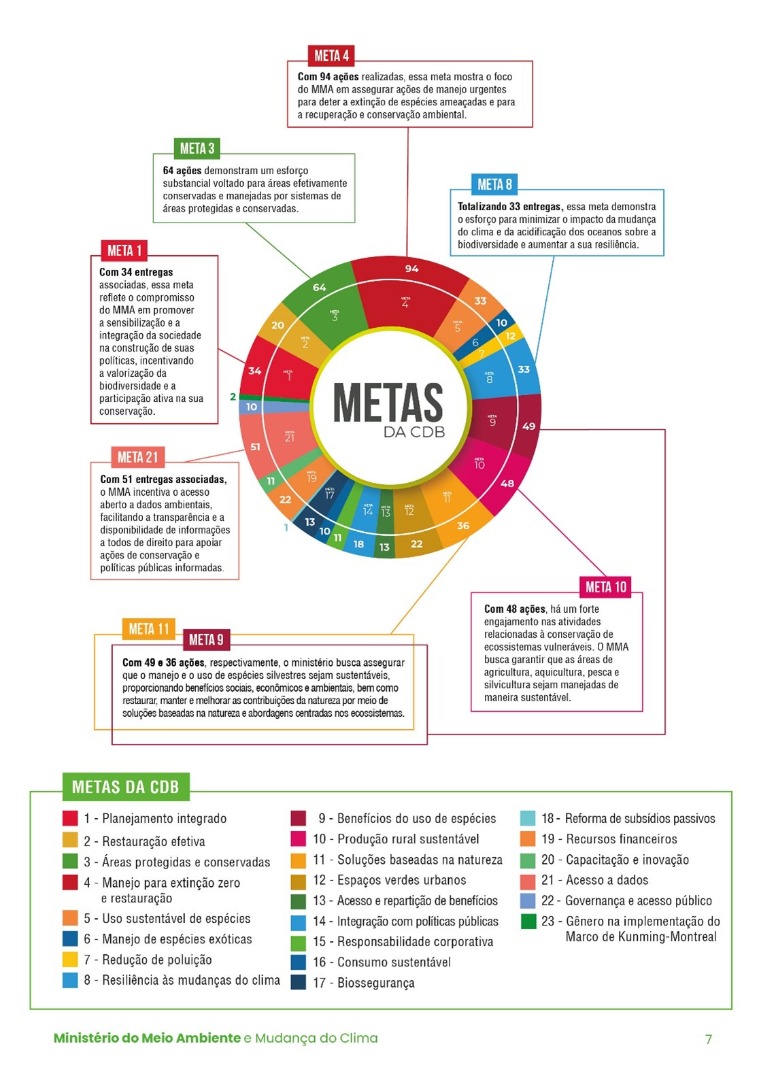 Considerando os resultados, produtos e ações, normativas, instrumentos regulatórios e projetos — sendo esse último destacados apenas os principais coordenados pela Secretaria Nacional de Biodiversidade, Florestas e Direitos Animais (SBIO/MMA), que é a secretaria com o maior número de projetos relacionados à biodiversidade — foram identificadas 617 associações com as Metas da CDB. As Metas 3 e 4 (focadas nas áreas protegidas e conservadas e na extinção zero), respectivamente, e as Metas 5 e 21 (focadas no uso sustentável da biodiversidade e no acesso a dados), respectivamente, foram aquelas mais comumente associadas com os diferentes tipos de entregas promovidas.