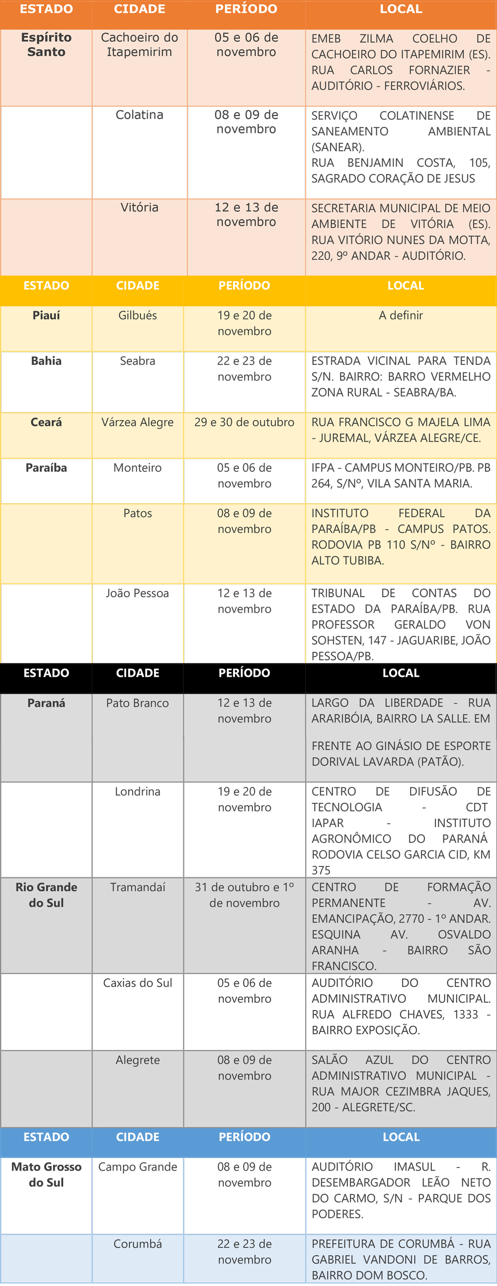 Os próximos cursos serão em Várzea Alegre (CE), de 29 a 30 de outubro; em Tramandaí (RS), de 31 de outubro a 1º de novembro; em Monteiro (PB), Cachoeiro do Itapemirim (ES) e Caxias do Sul (RS), de 5 a 6 de novembro; e em Patos (PB), Colatina (ES), Alegrete (RS) e Campo Grande (MS), de 8 a 9 de novembro. Também serão realizadas capacitações em cidades do Piauí, Bahia e Paraná.