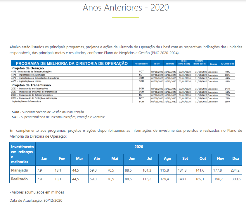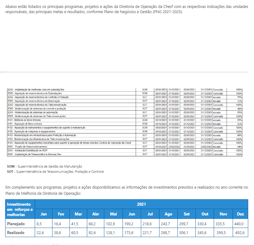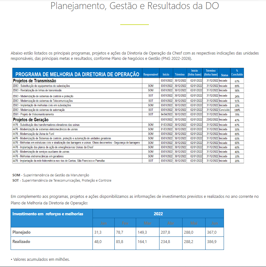 Os programas, projetos, ações, obras e principais atividades executadas Chesf são divulgadas no Relatório Anual e no Relatório de Sustentabilidade, ambos disponíveis em nosso Portal. Para conhecer mais, acesse Relatório Anual 2021, no capítulo “Planejamento Estratégico – Plano de Negócios de Gestão 2022-2026” e Relatório de Administração 2021, item 13 Investimentos.