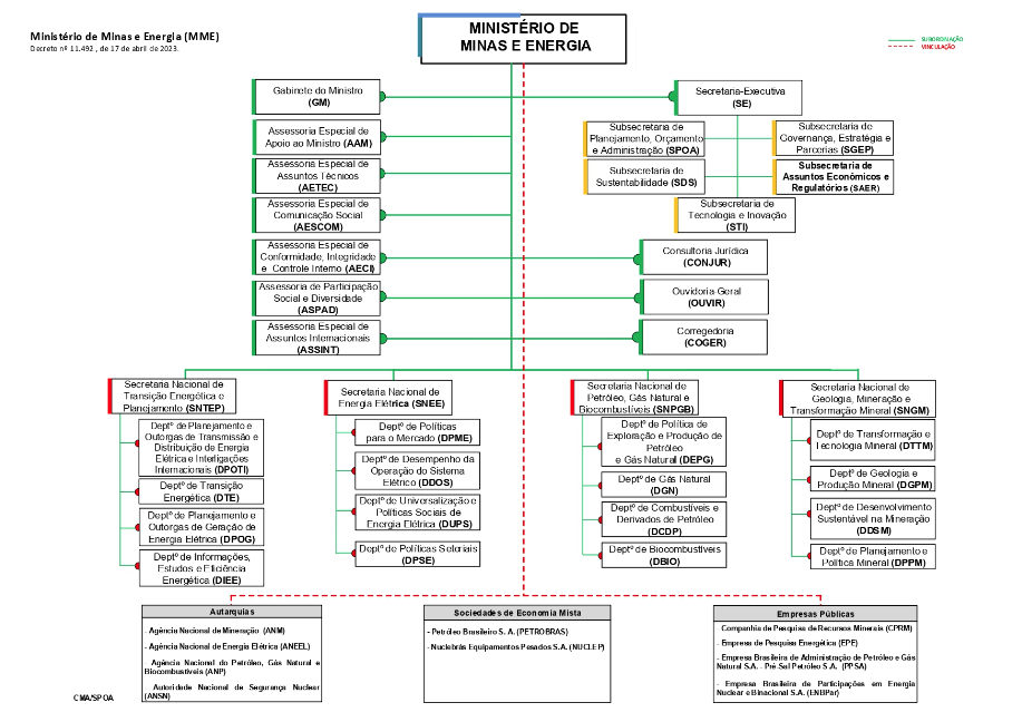 Decreto nº 11.492, de 17 de abril de 2023, que aprova a Estrutura Regimental e o Quadro Demonstrativo dos Cargos em Comissão e das Funções de Confiança do Ministério de Minas e Energia e remaneja e transforma cargos em comissão e funções de confiança.
