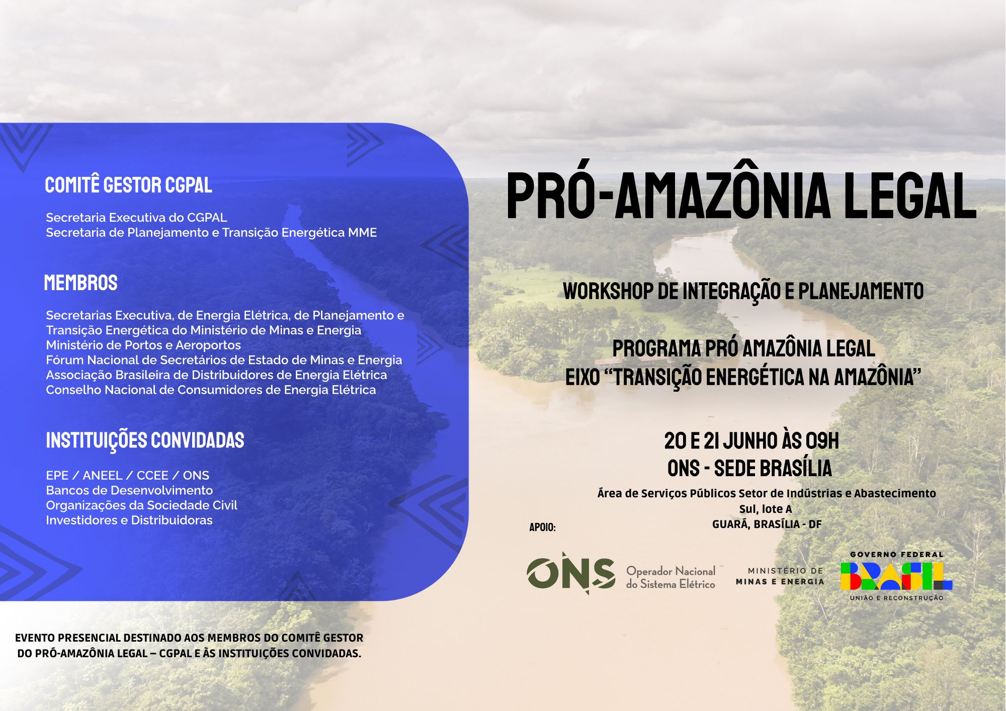 <p class="Paragrafo_Numerado_Nivel1" style="text-align: justify; ">A Secretaria-Executiva do Comitê Gestor do Pró-Amazônia Legal (CGPAL) organizou o <strong>Workshop de Integração e Planejamento Programa Pró-Amazônia Legal Eixo “Transição Energética na Amazônia” nos dias 20 e 21 junho de 2023, nos espaços Mezanino e Auditório do ONS, Sede Brasília</strong>, localizado na Área de Serviços Públicos Setor de Indústrias e Abastecimento Sul, lote A, Guará, Brasília - DF.</p>
