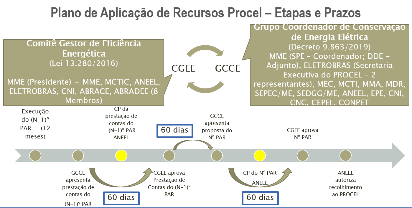 Dessa forma, em 2016 foi publicada a Lei 13.280/2016 que alterou a Lei 9.991/2000, garantindo que 20% do 0,5% dos recursos direcionados aos projetos de eficiência energética fossem destinados ao Procel. Para tanto, foi estabelecida uma nova governança para o programa, onde o Grupo Coordenador de Conservação de Energia - GCCE, coordenado pelo MME, tornou-se responsável pela condução do processo de elaboração do Plano Anual de Aplicação dos Recursos - PAR do Procel e foi instituído o Comitê Gestor de Eficiência Energética - CGEE, também coordenado pelo MME, com a finalidade de aprovar o PAR e acompanhar sua execução. Em 2019, o Decreto 9.863/2019 estabeleceu os regulamentos acerca do processo de elaboração e aprovação do PAR, conforme apresentado na figura abaixo.