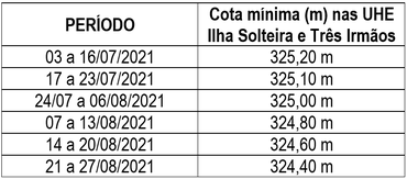 Com base nas deliberações do CMSE e nos estudos apresentados pelo ONS, considerando a necessidade de não comprometer a geração de energia elétrica para atendimento do SIN e o disposto na Medida Provisória n° 1.055, de 28 de junho de 2021, a Câmara de Regras Excepcionais para a Gestão Hidroenergética fixou as cotas mínimas de operação para os reservatórios das usinas de Ilha solteira e de Três Irmãos, conforme cotas mínimas e períodos indicados a seguir. Deverão ser realizados estudos nos próximos 15 dias pelo ONS, em conjunto com o Ministério da Infraestrutura (MINFRA) e o Departamento Nacional de Infraestrutura de Transportes (DNIT), sobre a operação hidráulica das usinas das bacias do Tietê e Paraná e a possibilidade de realizar ondas de vazão até o atingimento da cota 324,8 m nos reservatórios das UHE Ilha Solteira e Três Irmãos, na operação da Hidrovia Tietê-Paraná.