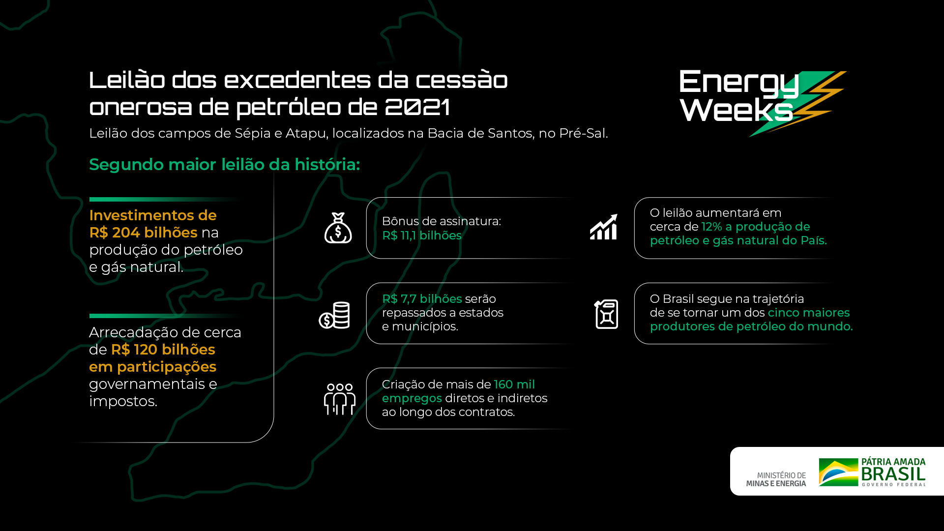 Segundo maior leilão da história , o certame faz parte das Energy Weeks. A expectativa é arrecadar mais de R$ 204 bilhões em investimentos privados para a produção de petróleo e gás natural no Pré-Sal. Devem ser arrecadados cerca de R$ 120 bilhões em participações governamentais e impostos e criados mais de 160 mil empregos diretos e indiretos ao longo dos contratos.