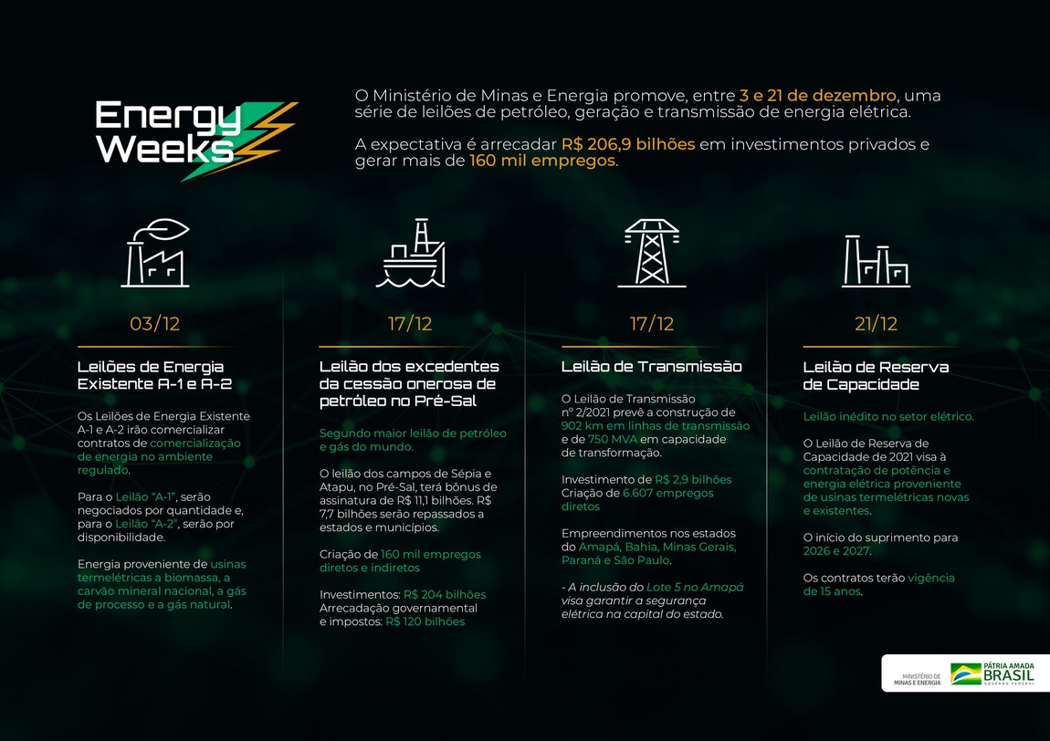 O Ministério de Minas e Energia (MME) promove, entre os dias 3 e 21 de dezembro, uma série de leilões de petróleo e gás e geração e transmissão de energia elétrica . Chamadas de Energy Weeks , a expectativa é arrecadar mais de R$ 206,9 bilhões em investimentos privados com as concessões.