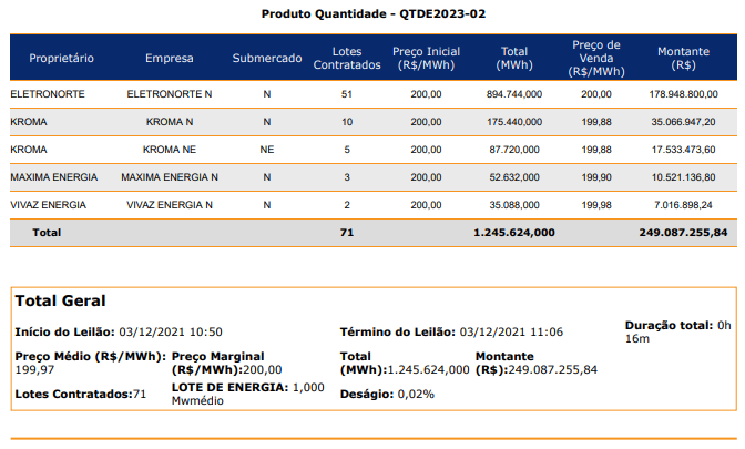 Já para o Leilão de Energia Existente A-2, o preço médio ficou em R$ R$ 199,97/MWh, alcançando deságio de 0,02%. Foram contratados 71 MW médios (ou 1.245.624 MWh), para suprimento no período de 01/01/2023 a 31/12/2024. As empresas vencedoras são Eletronorte, Kroma, Máxima Energia e Vivaz Energia, que venderam para as distribuidoras Celpa, Cemar e CPFL Jaguari.