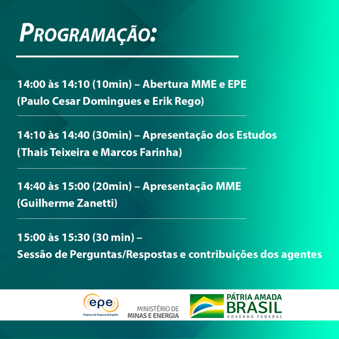 O Ministério de Minas e Energia (MME) e a Empresa de Pesquisa Energética (EPE) promovem na próxima terça-feira (19/04), às 14h, no canal da EPE no YouTube , webinar para apresentação do "Estudo de Escoamento de Geração da Região Nordeste” e do “Estudo para ampliação das Interligações Regionais” para os agentes do setor.