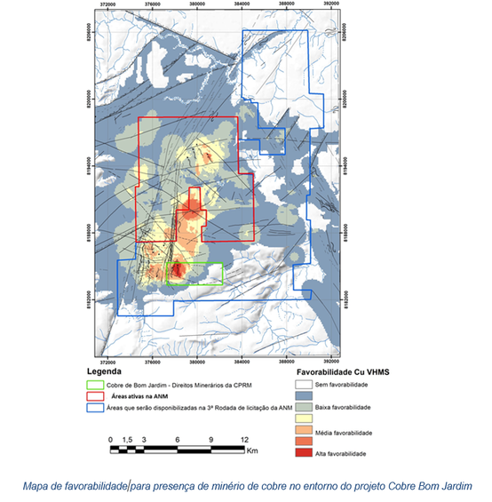 A partir dos dados levantados pelo SGB-CPRM foi elaborado um mapa de favorabilidade para presença de minério de cobre no entorno do projeto Cobre Bom Jardim. O mapa, elaborado através da interpretação dos dados de mapeamento geológico, medidas estruturais, levantamentos geofísicos e geoquímicos em conjunto com informações e conceitos estabelecidos para o tipo de mineralização indica quais áreas são favoráveis para a presença do minério de cobre.
