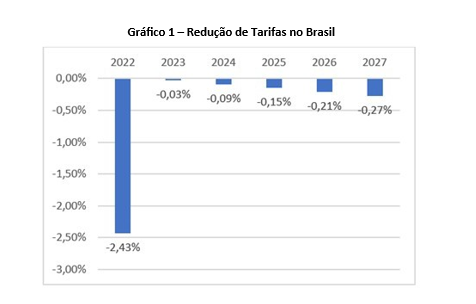Salienta-se que os impactos tarifários por região e, na média, do Brasil, foram referenciados com base nas tarifas B1 residencial e, portanto, expressam a estimativa de impacto tarifário nestas tarifas e foram observadas as informações do último processo tarifário de cada distribuidora que se tinha à época de realização desse estudo, mais precisamente, os processos deliberados até 9 de maio de 2021, considerando ainda a descotização em 5 anos, a uma taxa de redução de 20% ao ano, e constantes demais variáveis.
